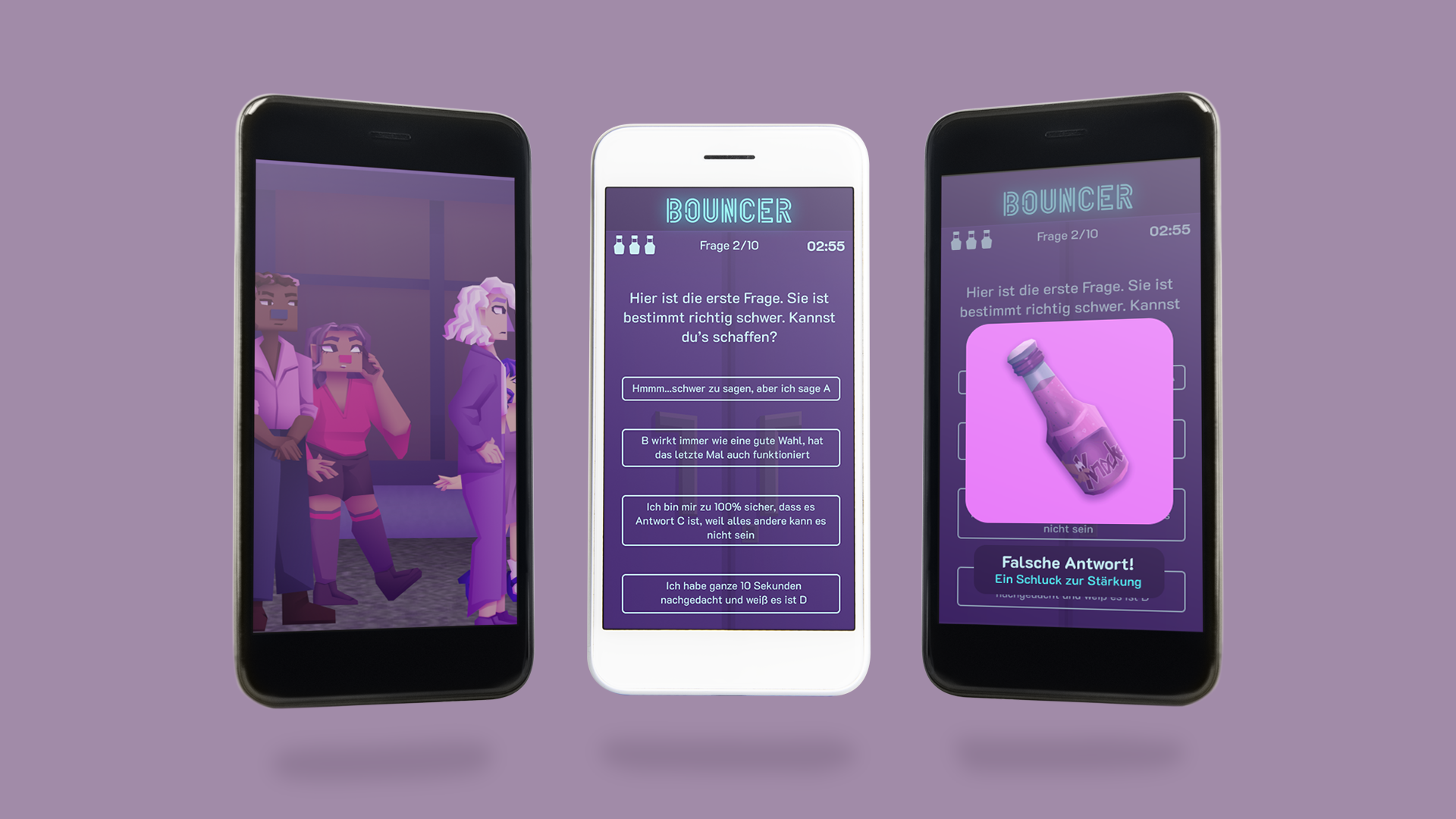 I kicked off the project by creating static wireframes and mock-ups to map out the overall user flow. Since the game would primarily be played on smartphones, we focused on the mobile version first. After finalising the wireframes, I put together a moodboard and some concept art for the intro and outro cutscenes, which I then presented to my supervisor. We decided on a cool, neon-accented colour palette to reflect the atmosphere of nightlife. Visually, the goal was to create something that stood out, bolder and more characterful than the typical clean, minimal quiz game.